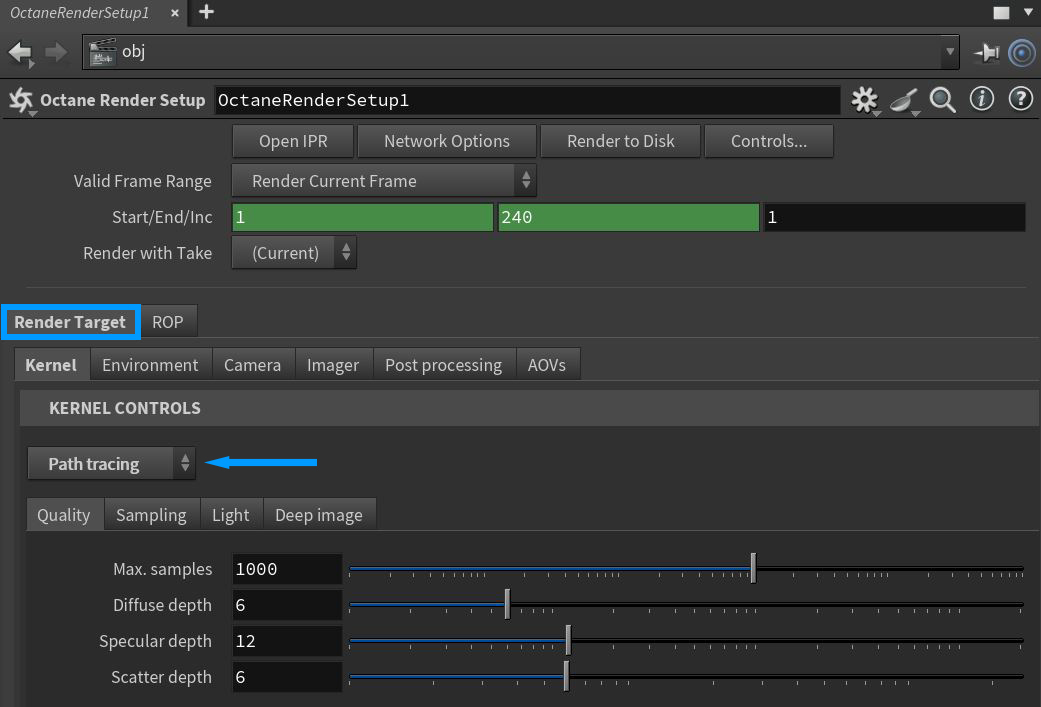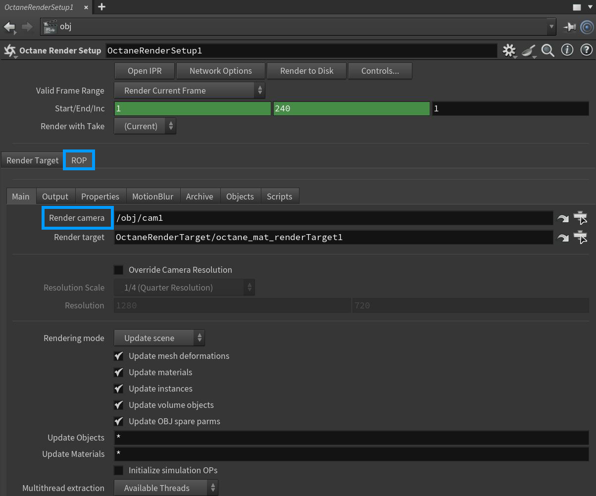 The Octane ROP settings are the core of the OctaneRender plugin. In the ROP tab, you need to select a camera to use for rendering as the Render Camera parameter is looking for a cam1 by default (figure 3).