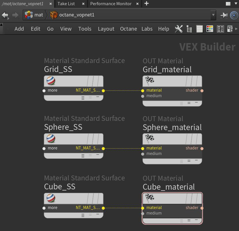 The SHOP or MAT network can be used to add an Octane material with the MAT network being the preferred workflow using an Octane Material Builder (VOP NET) node (figure 7a). Inside the VOP NET, create three materials for each of the scene objects (figure 7b). See the Material section for more details. For quick material assignments, the Octane Quick Material can be used as well.