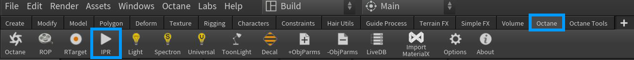 We are now ready to render our first OctaneRender scene. Go to the Octane shelf and click on the IPR button (Figure 8). You can also access the IPR window from the Octane ROP node. The IPR window is the core of the Octane interactive renderer (Figure 9). You can zoom and pan over the image with the mouse buttons and wheel, reload the scene after a change, select the render passes or layers, or pick the focus point or the material under the cursor.